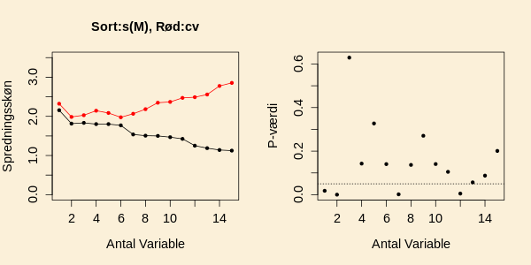 spredningsskønnet og -værdien for test af hypotesen, at